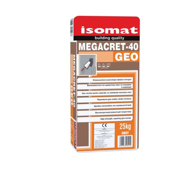 MEGACRET-40 GEO conține aditivi speciali, care sunt capabili să penetreze adânc în beton și să formeze un strat protector pe suprafața armăturii. Este clasificat ca mortar pentru reparații pe beton de tip PCC R4, în conformitate cu EN 1504-3. Este clasificat ca produs pentru protecţia armăturii contra coroziunii, conform standardului ΕΝ 1504-7.MEGACRET-40 GEO este adecvat pentru reparații la elemente din beton foarte solicitate. Se aplică cu mistria sau mecanizat prin torcretare pe pardoseli, pereți sau tavane